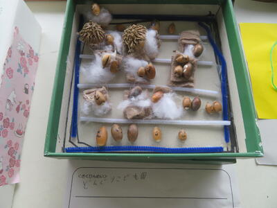 木の実や、落ち葉、つる等、秋の材料で作った作品が学校のあちらこちらに。