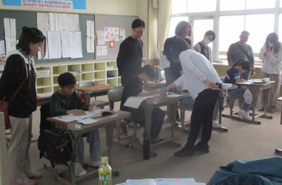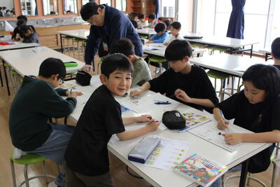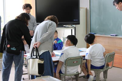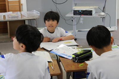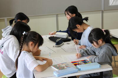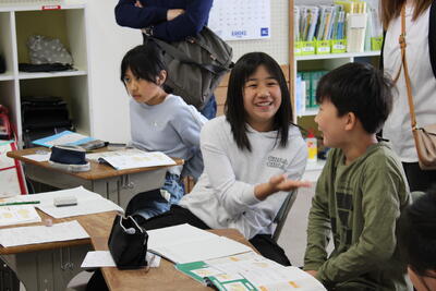 1年生と6年生がそれぞれの課題を一緒のテーブルで考える