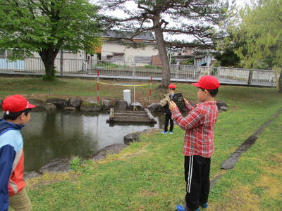 谷地中部小学校では池の周りを散策