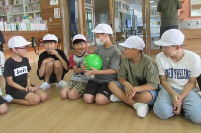 昼休みには、わくわく集会。全校生でボール回しゲーム。
