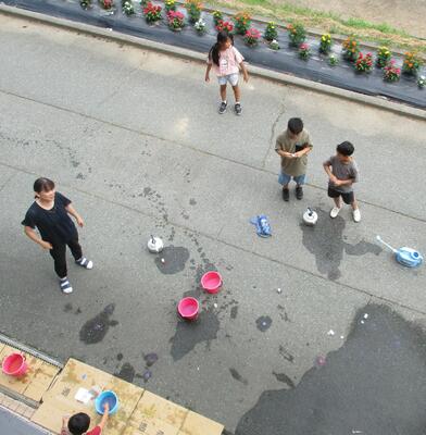 玄関前では、バブロケット飛ばしの歓声が響きます。