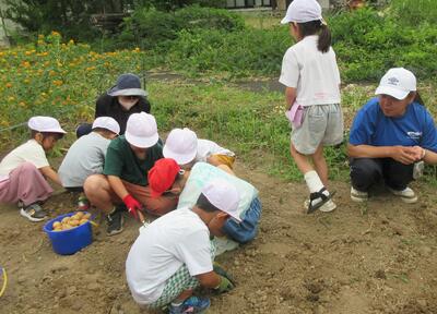 久しぶりに過ごしやすい天気の今日、1,2年生が植えたジャガイモを収穫。
