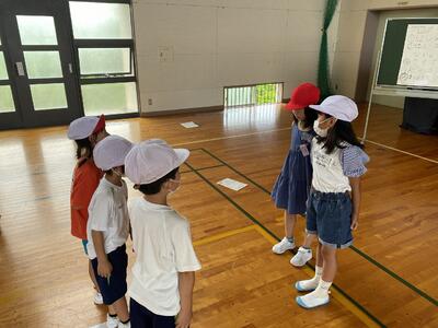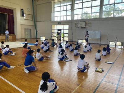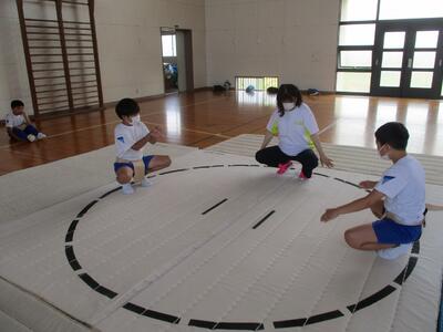 子供たちは、体育館で相撲の取組みを行います。