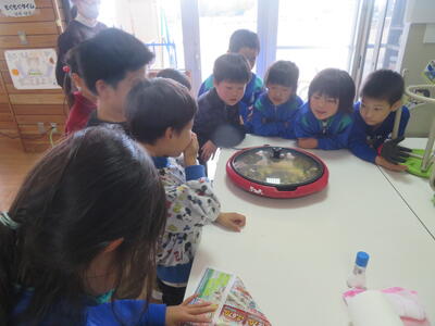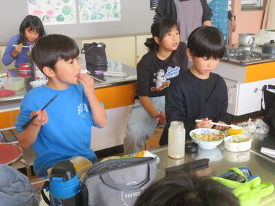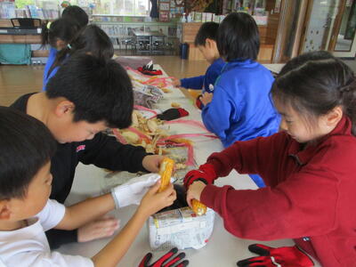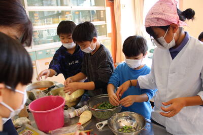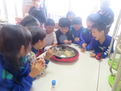 学校にもどった1、2年生は、おやつのポップコーン作り