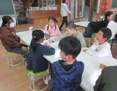 縦割り班で集まって日常の中のうれしかったことを出し合いました。